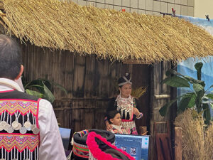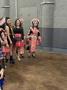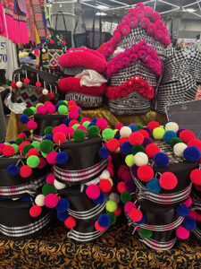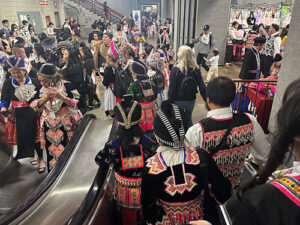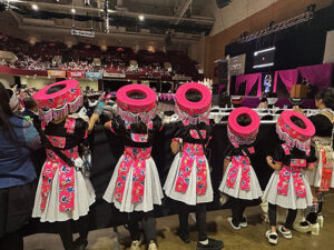 The traditional lunar calendar observed by Hmong people marked Saturday, Nov. 30 as the last day in 2024, and Dec. 1 as actually New Year’s Day. Hmong New Year’s beliefs are tied to ancestor remembrance and the renewal of shamanistic energy. Yet the Hmong New Year I experienced with my outsider eyes was a very jolly celebration with upwards of 40,000 people streaming into River Centre, a huge convention hall in Saint Paul, MN. I was dazzled by the colors and complex embroidery of clothing worn by women, men and kids. The jingling of thousands of silver coins and strands of pearls on people’s clothes filled my ears. I marveled at the complexity of different hats and the festive high heeled shoes many wore to set off their finery. It seemed the most popular color was pink—often accented with green and black. Brilliant!