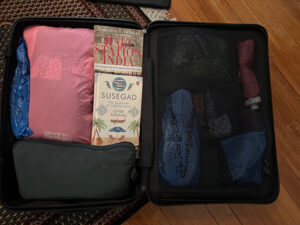 Loose cream straight-leg polyester pleated pantsGrey cotton capri pantsBrown tech poly jogger pantsBlack-white patterned shortsAnkle-grazing dark blue-print polyester skirtBlue and coral printed wrap skirt, knee-lengthMid-calf burgundy silk skirtCasual Blue cotton gauze dress/swimwear coverupWhite crinkle poly blouse, sleevelessWhite button-down shirt, sleevelessBlack T-shirt (borrowed from spouse)Coral cotton broadcloth button up blouse with mid-length sleevesNavy blue silk short-sleeved topNavy blue cardigan1 Bathing SuitUnderwear for 6 days (will use laundry and detergent packages)3 pairs socksFlat packing hatTwo scarves: one short chiffon square, one very long rectangular dupattaCoach Whitley Mary JanesTaos Trophy sandalToiletries galore, small sizes in a waterproof carrying case! Be sure to include mosquito repellant wipesEXTRAS SUCH AS GIFTS: If you’re going to someone’s home or meeting someone professionally, it’s very nice to bring them a gift from the U.S. Signed books by you or others are enthusiastically received. Other items I’ve liked to bring are packaged nonperishables from Trader Joe’s or similar yummy specialty stores. Warning: chocolate always seems to melt. This year I’m bringing a special American biscuit baking mix, two candles, and some specialty nuts. Just three gift books will be making the journey…and because of my packed carry-on, I’ll have to ask my husband to be responsible for them.