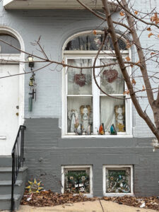 Copy Cat Building, now Apartments for ArtistsIn Station North, tidy rowhouses and massive old brick factories have become havens to live and work in. Many homeowners have painted their homes in soft colors and some artists have painted extraordinary murals in public spaces. It’s a gorgeous sight, and it appears to be a racially mixed neighborhood with some properties still in the hands of original owners, like the one below. I’m guessing this because angel statuettes in the window are a very old Baltimore tradition.