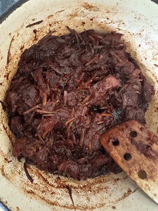 I am always looking for shortcuts, so I decided to try simmering my chutney in a slow cooker. After a night’s cooking on low, I was disappointed that the temperature was just a bit too low for the chutney to thicken. So, I poured the warm mixture of tomatoes, spices and vinegar into a ceramic-coated Dutch oven, and after I brought it to ha happy boil, I lowered the temperature to simmer and partially covered the pot. About four hours later, the red chunks swimming in vinegar had reduced by half into a rich reddish brown, sticky concoction. I added just a tiny bit more sugar and salt to taste, and the chutney was ready to cool in the fridge.