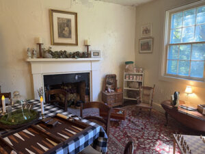 After the book talk, I tiptoed up a narrow staircase and explored three more rooms. One was a sleeping porch, now closed in, from the twentieth century and still furnished like an old-fashioned bedroom. The second room was a nursery bursting with toys and oddities. The other original bedroom contained a melange of antiques, among them a gilded purple velvet gown that somebody’s great aunt is said to have worn to a Presidential inauguration.