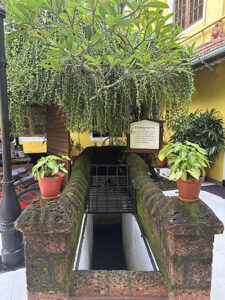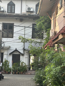 This particular hotel was originally a grand 19th century house built by the Dutch that later became the home of a prominent Jewish merchant family. This family added a mikvah in the courtyard. Colors are bright, from the stucco to the tiled stairs, and the spiral ironwork stairs are typical for Fort Cochin.