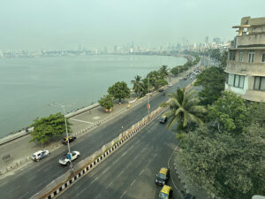Due to its location in the UNESCO-designated historic art deco district, the Intercontinental had to fit in with the surrounding 1930s neighbor buildings. Thus, the fully modern building was designed with one rounded side and a short turret on top, right next to the rooftop swimming pool. We stayed on the fifth floor, and the exterior of the suite was a long, curved wall of glass windows showing a triple-sided view of the water and Marine Drive. Standing in our room, gazing out at the breathtaking sunrise, I caught sight of a slowly growing number of people people jogging, walking, and doing group yoga and calisthenics. The Marine Drive promenade is bordered by a short wall that’s perfect for sitting; and here were many couples and student pals and retirees enjoying intimate time as the city woke up.
