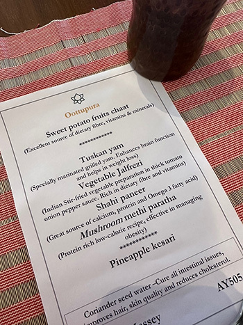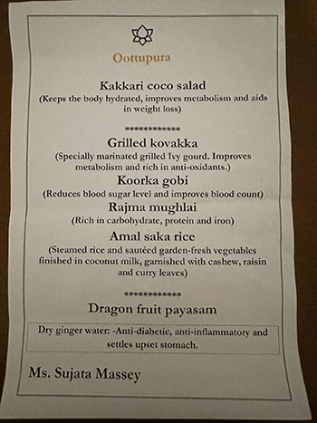Another LunchSome samples of my personal prescribed menus are above. Each time I come to my table (dining in silence without use of devices is encouraged), a cup of warm water arrives in a copper cup along with my menu. A serving of two vazhakoomvu tikka, perfectly crispy banana-flower fritters, is “rich in fibre and protein, effective in treating infection and shows down the aging process.” Idichu thalichathu, stir-fried yam with crackled mustard seed and curry leaves, “enhances brain function and helps in weight loss.” Cheera Mappas, sautéed red spinach in coconut coriander gravy, “restores energy, improves vitality and blood count.” Promises, promises! If I live here forever, does it mean I’ll always be alive?