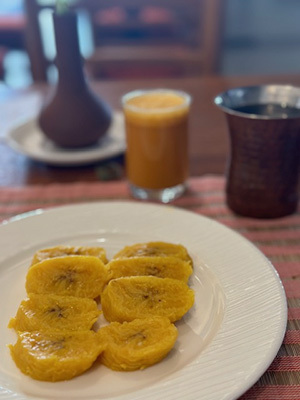 First course for a breakfast: steamed bananas Breakfast course two: ragi dosa, sambar, beet chutney