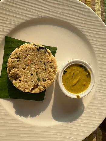 Breakfast course two: ragi dosa, sambar, beet chutney Another breakfast: uppma and turmeric chutney