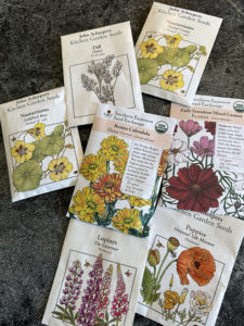 This year, I fell prey to seed catalogs and seed company websites promising perfect mixes for pollinating insects and birds. Who can resist the allure of the elegant botanical illustrations on paper seed packets? I certainly can’t—and I swoon over these flowers’ elegant Latin names, like cosmos, helianthus, calendula, and lobularia. Don’t these names fit heroines in an upcoming season of Bridgerton? Even more racy are the varietal names made up by growers: Orchid Cream, Milk Maid, and Black Velvet. These are just a few of the varieties of nasturtiums that I’ve ordered from John Scheepers Kitchen Garden Seeds. Because these flowers are annuals, my plan is to plant them in pots and the ground near any vegetables and flowers that attract aphids—and to eat whatever blooms they miss in salad—or better yet, on top of cake!
