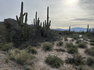The most ubiquitous cactus is the saguaro, native to the Sonora desert and capable of growing up to forty feet tall. I learned that these mega plants take a long time to get started: up to twenty years to grow the first twelve inches. However, they may live more than 150 years, and sometimes have upwards of 50 arm-like branches. Mature saguaros can weigh three to four thousand pounds, weight that comes from being filled with water that slowly feeds their own growth and the host of animals and insects that come to them for sustenance.