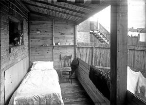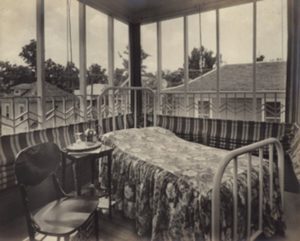 Elevated porch sleeping areas were believed to provide protection against tuberculosis and other contagious diseases, as well as providing relief from the heat. Some people were able to afford mosquito wire (aka screens) that further protected family members from insect bites. They were very popular in the period between 1910 and 1920, when homeowners added them on as renovations, the way we might add a mudroom or a family room to a house today. Our house was built in 1897 with the sleeping porches an integral part of the original design. Old-time electric lamps hang from the porch ceilings, which seems more evidence that these spaces were intended for socializing, game playing and reading before bedtime.
