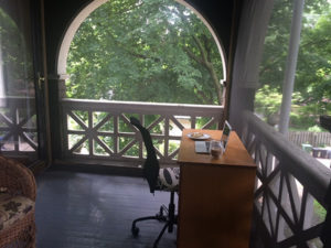 To be clear, I’m not in a tree fort, nor is it one of those trendy structures you see in AirBnB ads, a house built in a tree. I’m safely in my house, but also outdoors on roof level, writing on the house’s western-facing sleeping porch.