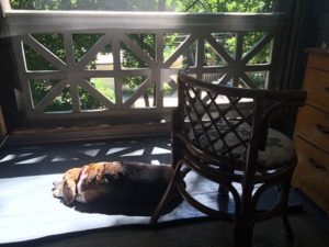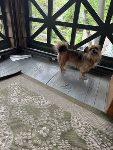 But nobody really looks at the furniture. The best thing about the porch are views right into the high branches of the trees. I’m captivated as I see squirrels chase each other along branches and then jump like Olympic athletes to the next tree and finish up by springing onto our roof. Sometimes, a squirrel explores all the way up to the edge of the screen separating us. At the sight of me, or my tiny snarling dog, the squirrel shoots back to a safer zone.