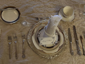 A grand dining table that is original was laid with old silver-plate sourced from Goodwill. It’s a good thing it wasn’t sterling, because a dessert spoon recently disappeared during tour hours.