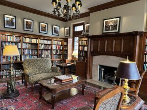 The mansion is vast, with an imposing wide, curved wooden stairway. There’s an elevator, but a sign that says “No Riders.” The grounds outside are in the midst of renovations, although the house’s interior is immaculate. The ground floor boasts a beautiful library filled with vintage books, games, and antique furniture. The house itself has been divided into eight suites, all with private bathrooms, and some, like mine, with a sitting room that had sweeping views from the bluff over St. Paul and the Mississippi River.