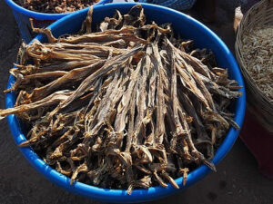 Bombay Duck is the Anglo-Indian nickname for a species of lizardfish called Harpoon Nehereus in Latin, and boomla, bummalo, bombil whose habitat is tropical areas of the Indian and Pacific Oceans. They are best know for being fished in Maharashtra, the state that was known in colonial times as Bombay Presidency. Some have suggested that the nickname is related to “Bombay daak,” a famous train of that British ruled era, but that doesn’t seem particularly likely, because people started calling the fish this name before that long distance train existed. It was eaten locally in a number of ways, and it was also canned for export.