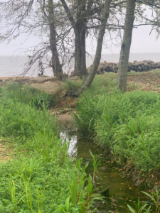 A neighbor’s house on temporary risersAs I walked around the neighborhood filled with lush trees and tropical foliage, I noticed most houses were on pilings, and others were in the process of being raised, with blocks underneath. I gazed into the neighborhood’s ditches, a historic and simple way to assist with the diversion of overflowing lake water. These ditches are cut into the earth alongside the roads near the lake. The ditches held murky water, weeds, and occasionally, visitors from the lake. We were advised to go out walking carrying a long pole in order that an alligator might emerge and behave aggressively. During our walk, it turned out the gators had better places to be.