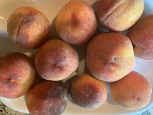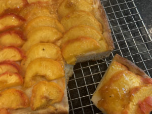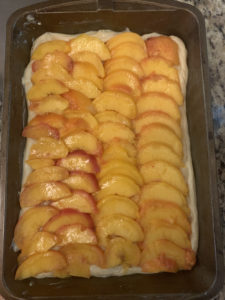 I believe it’s the typically hot summers in our Mid-Atlantic area that make our peaches so juicy and sweet—and also the warm temperatures in July and August that make baking this cake possible. After all, it’s a yeast dough. Once that’s coddled and stretched into a pan, you top it with straight lines of peach slices. It’s that simple. However, the time to prep and bake was about three hours for me. Not a quickie, by any means.