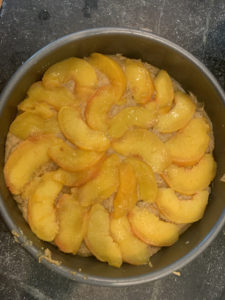 The exposure therapy worked! After an hour, I thought the dough had grown slightly. I was able to easily stretch the dough to fit a 9×13-inch pan. Baltimore peach cake recipes aren’t usually specific about whether you need to peel the peaches. However, the paleo peach cake recipe called for getting the skins off, so I did take the skins off all the peaches by dipping them for a minute in boiling water. How pretty and promising the Baltimore peach cake looked once the peaches were laid in place!