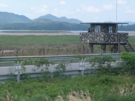 We drive into the lush Korean landscape, with rolling mountains in the distance, and green swampy fields on both sides of the road. Perched along the highway are guard shacks painted camouflage colours, with soldiers watching the horizon at each one.