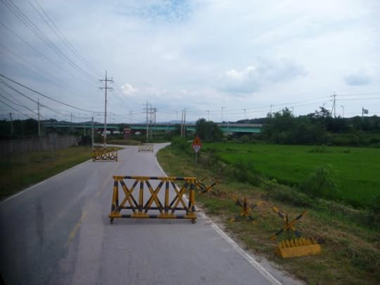 As you get closer to the North Korean border, the road has huge metal barricades. Our vehicle is now driving in an "S" pattern, switching from lane to lane.