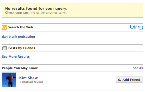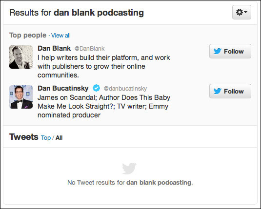 Go ahead, try to find the link I shared on Twitter. You can’t. Twitter delivers zero tweets when you search on my name and the word “podcasting.” All it can do is recommend that you follow two people—me and some other guy: