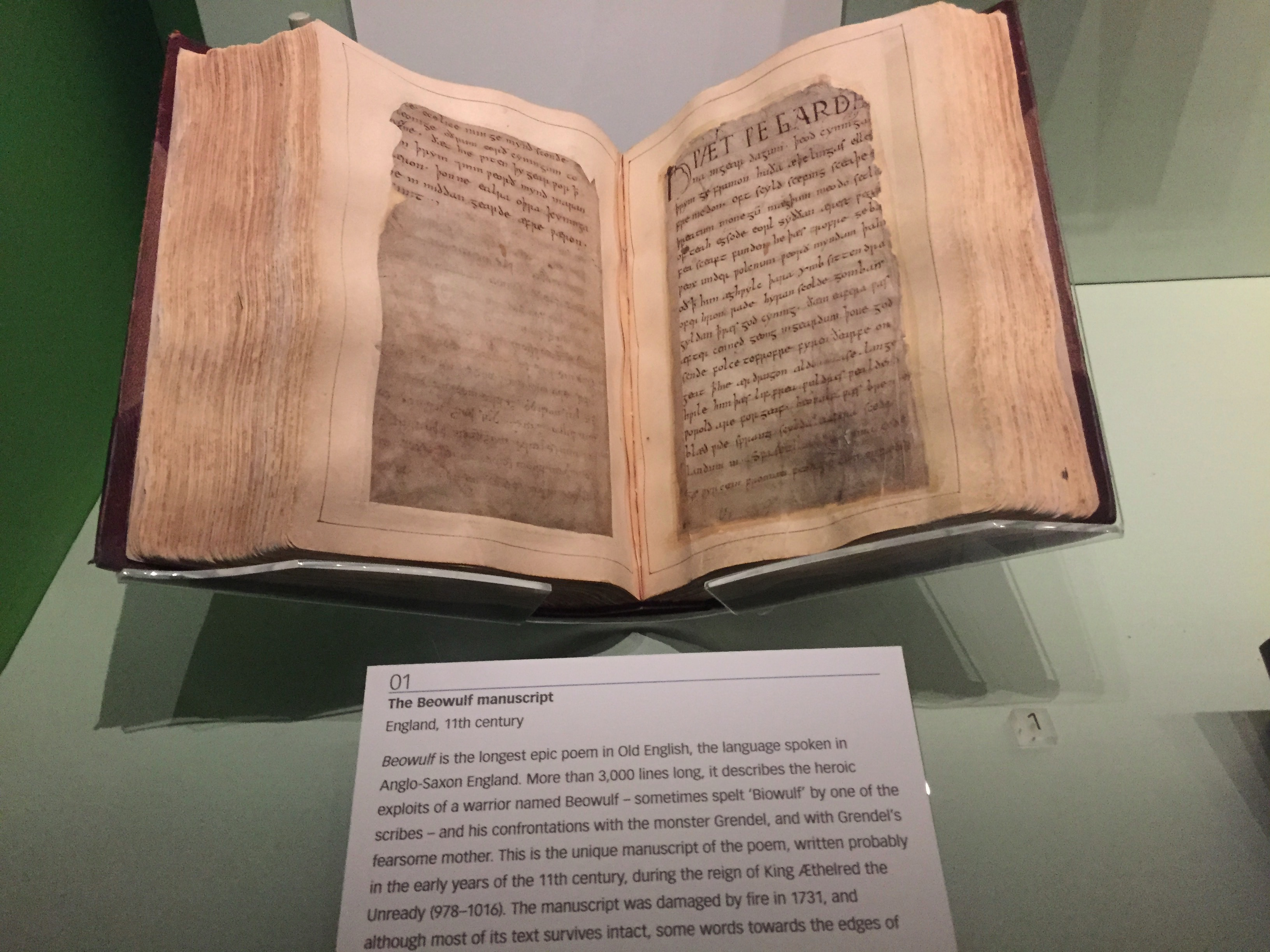 There was a break then, and a tour proposed of the Treasure of the British Library, and oh my God, what Treasures they were! I gasped aloud in places. Anyway, they had the following awesome stuff on display – the original copy of Beowulf. BEOWULF, with burnt corners.