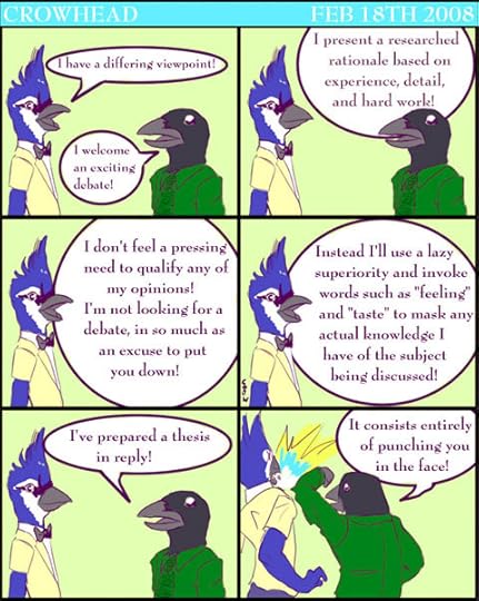 Bwah ha ha ha ha… This cartoon sums up the total pointlessness of arguing on the internet. I actually ran into one of these today, tried to be reasonably and argue my point in debate fashion, while the other poster devolved into insults. You think by now I should know better… Kudos to 3C member Michael for digging this one up. Anyone know who created Crowhead so I can credit the artist in this post too?