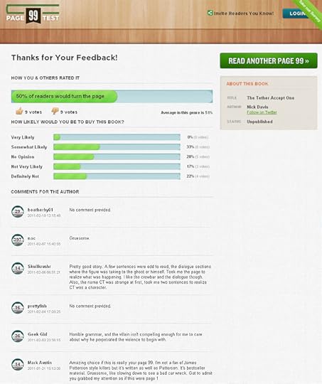 Now for a little explanation what Page99test is all about. For a while I had a preview page up on Page99Test.com from Accept One. The website takes page 99 from your book, and with no explanation or story set up places it to be cold reviewed. The idea being you read page 99, and it should hook you enough to turn the page to find out what happens next. Reviews have been mixed because of the lack of context going in, but its been an interesting experience. You can learn more about page99test.com by clicking here.