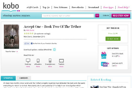 I am now happy to announce that Accept One, the second book in the Tether Saga is now available in eBook (ePub) form for the Kobo reader, and now available worldwide through the Kobo Bookstore, you can check out the listing by clicking here.