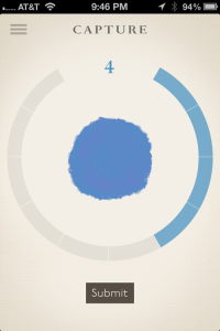 In response, you turn an onscreen dial, providing a subjective rating from 1 to 10. As you move your finger, a corresponding inkblot grows in size and color on the screen, from a subdued blue dot to a bursting crimson splash. (The precise meaning of these kinesthetic ratings is left for you to decide.)