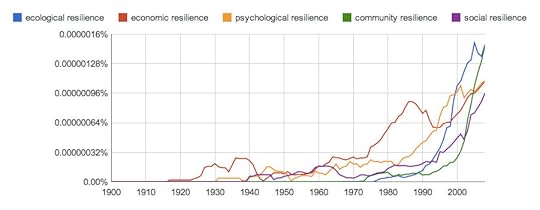 For example, use of the term resilience has more than doubled since 1990. More interestingly, here the graphs for five terms: ecological resilience, economic resilience, psychological resilience, community resilience, and social resilience: