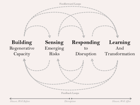 Another important feature of the framework is concurrency — a truly resilient system (or community, or person) is engaged in all of these activities all the time, albeit with different emphasis from moment to moment. Each activity influences the whole; it’s the connections between these activities that imbue the system with dynamism and adaptability.