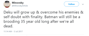 Here we see an example of that in discussing Batman, the ever re-invented character who bears both the burden of the past and the burden o...