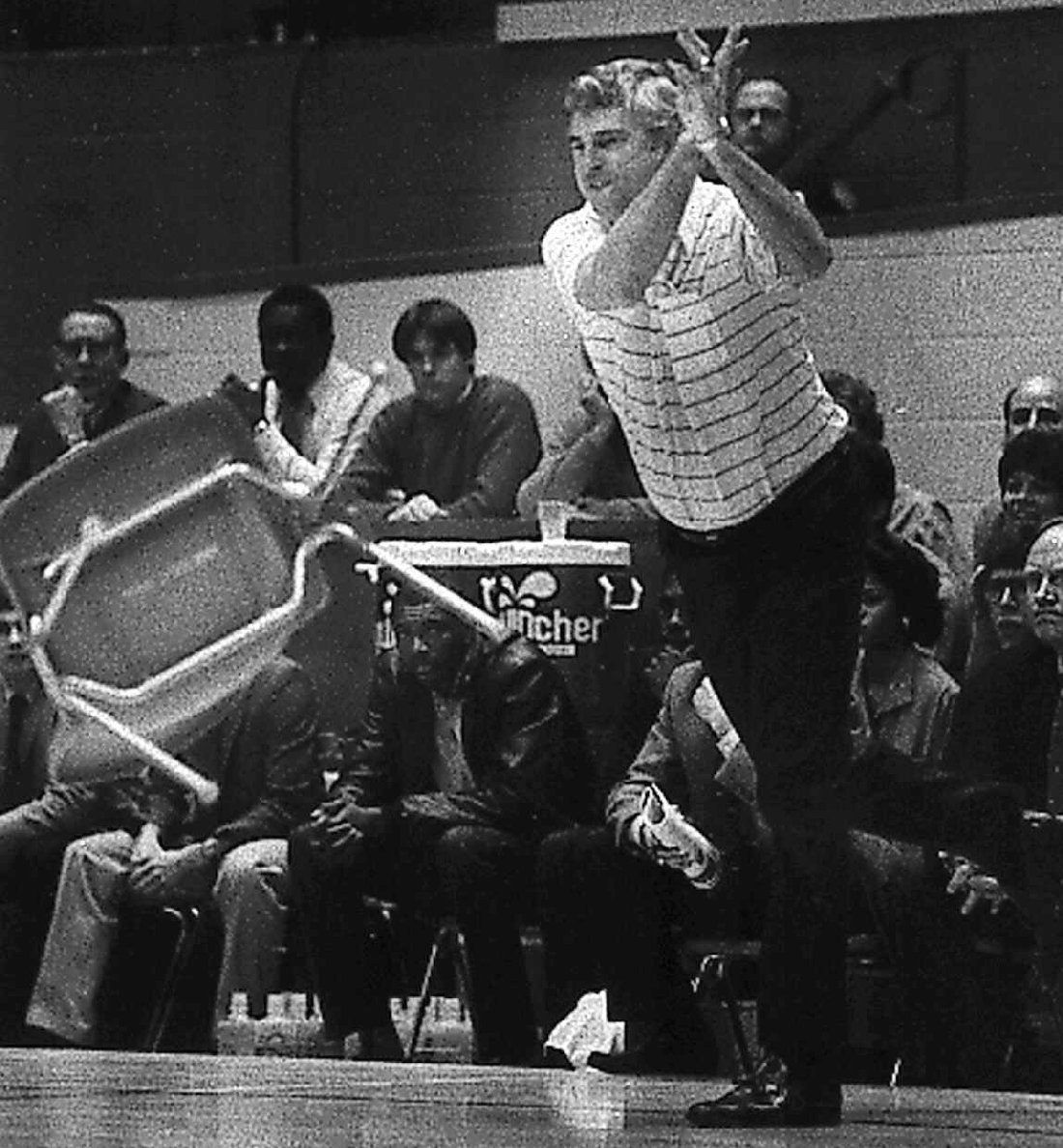 Once on the bench, Knight didn't even have to threaten to throw chairs. Once, however, a lawyer dared to object to a ruling. "I don't care what the ruling of the Supreme Court is," Knight said, "this is my ruling. Objection overruled. And next time, call me Mr. Judge Knight."