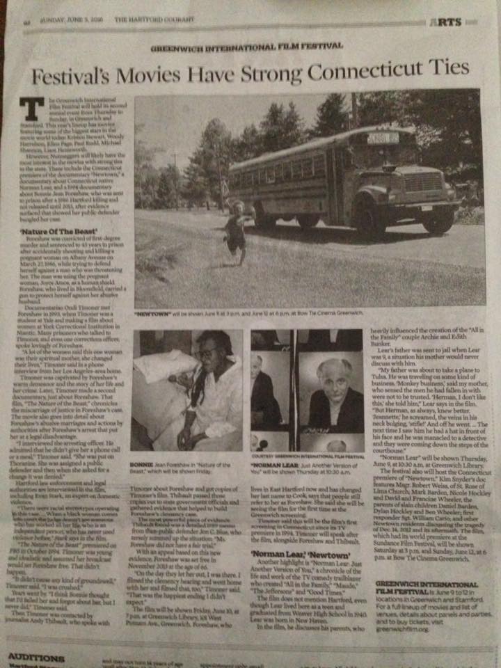 However, Nutmeggers will likely have the most interest in the movies with strong ties to the state. These include the Connecticut premiere of the documentary "Newtown," a documentary about Connecticut native Norman Lear, and a 1994 documentary about Bonnie Jean Foreshaw, who was sent to prison after a 1986 Hartford killing and not released until 2013, after evidence surfaced that showed her public defender bungled her case.