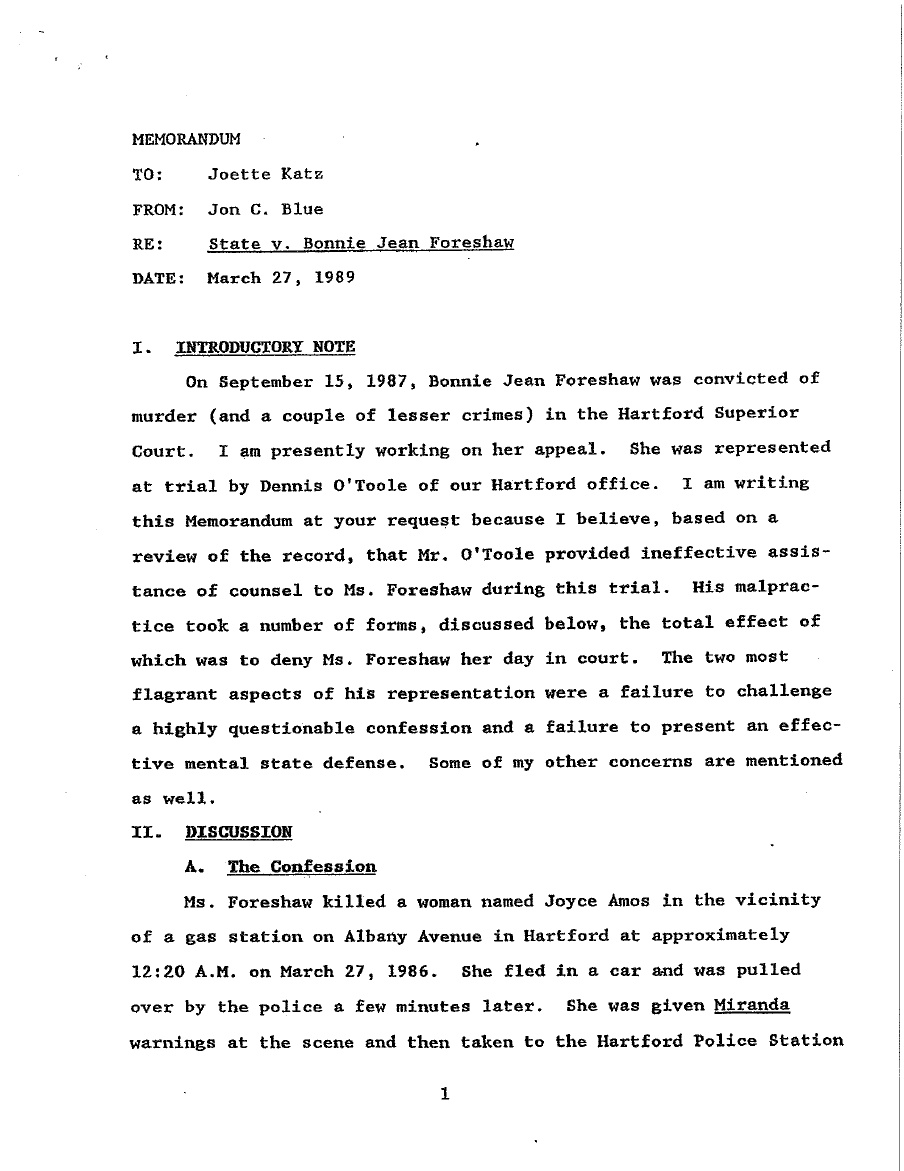 The memo was made public in a Cool Justice column published in May 2013 by the New Haven Register, The Register Citizen of Torrington, The Middletown Press and Litchfield County Times. Foreshaw was granted clemency six months later after the state reversed a decision denying her a hearing.