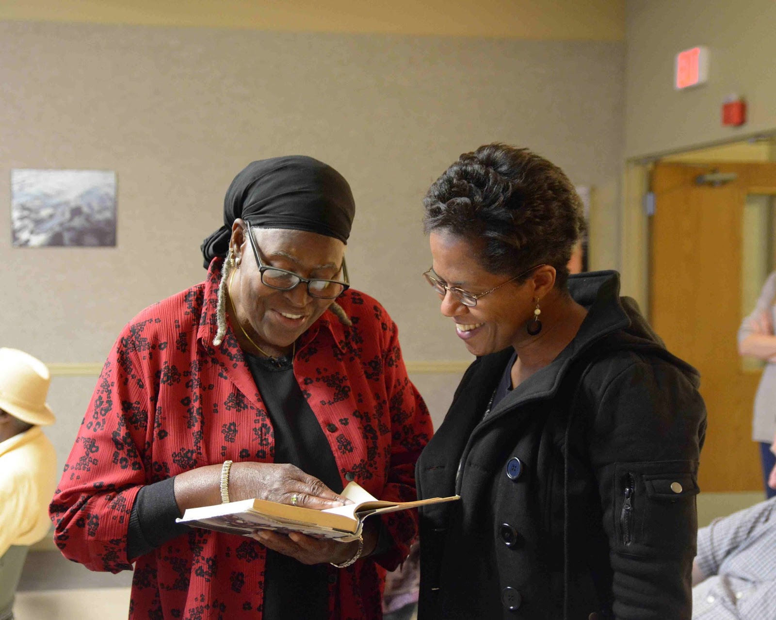 - Bonnie Foreshaw and LuVonney LaMar peruse the second collection of essays by prisoners at the Niantic jail -- "I'll Fly Away" -- which Lamar recorded as an audio book for blind.