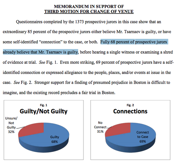 The defense team argues that out of 1,373 prospective jurors, 68 percent believe Tsarnaev is guilty of taking part in the Boston Marathon bombing. If one adds to that personal connections or allegiances to people affected by the terrorist attack, the number of jurors who already have a reason to vote for guilty leaps to 85 percent, according to a motion filed by the defense.