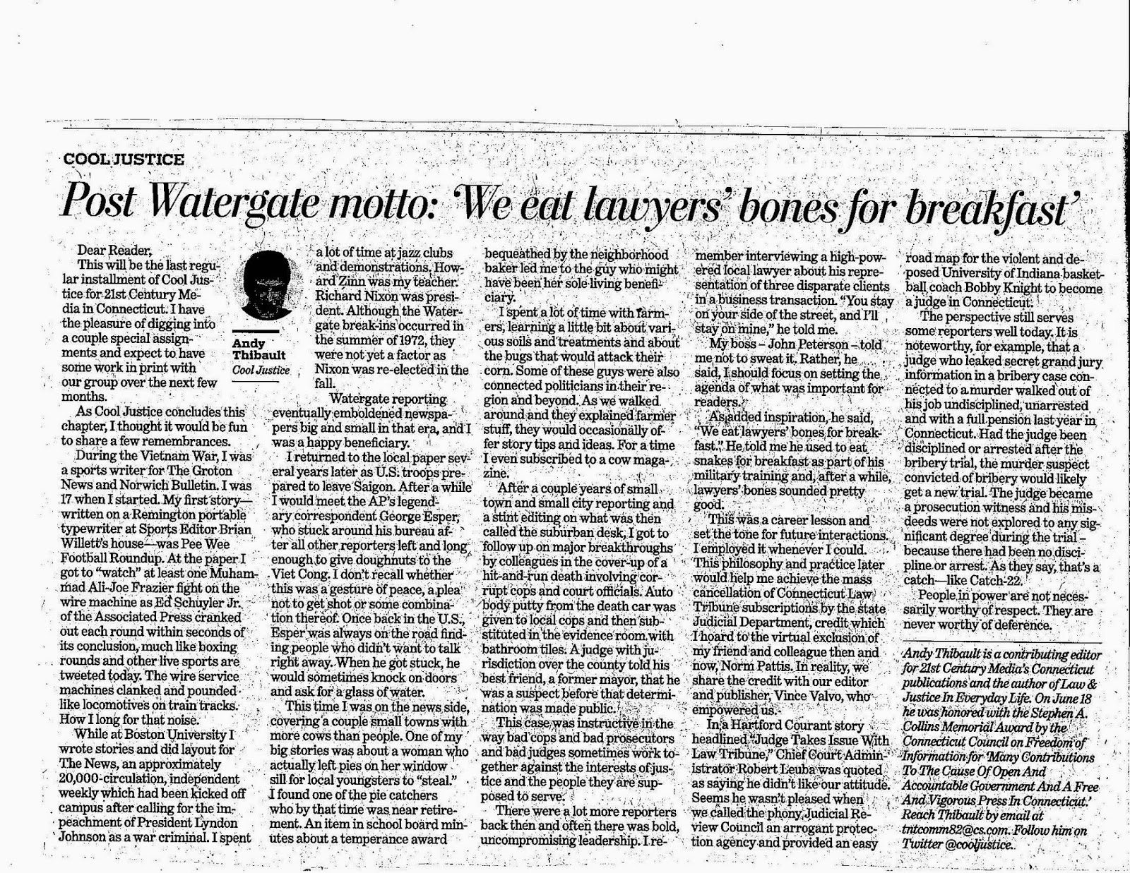 This will be the last regular installment of Cool Justice for 21st Century Media in Connecticut. I have the pleasure of digging into a couple special assignments and expect to have some work in print with our group over the next few months.