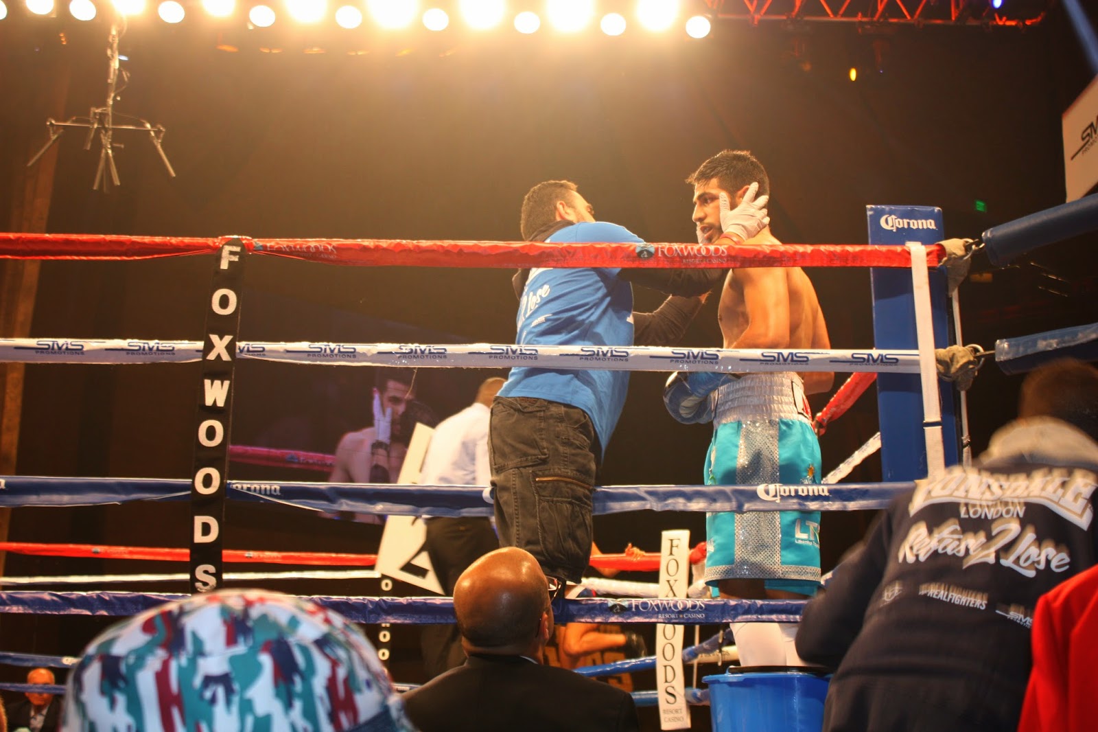Corner man checks out Dib, who suffered a head butt in the first round. Dib, a former featherweight champion, improved his record to 37 wins against three losses.