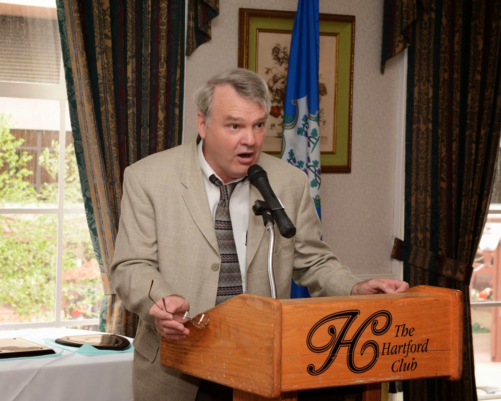 Chief Matt Reed at Hartford Club with Mary Connolly, retired editorial page editor of the Danbury News Times. Behind Reed is Claude Albert, retired managing editor of the Hartford Courant.