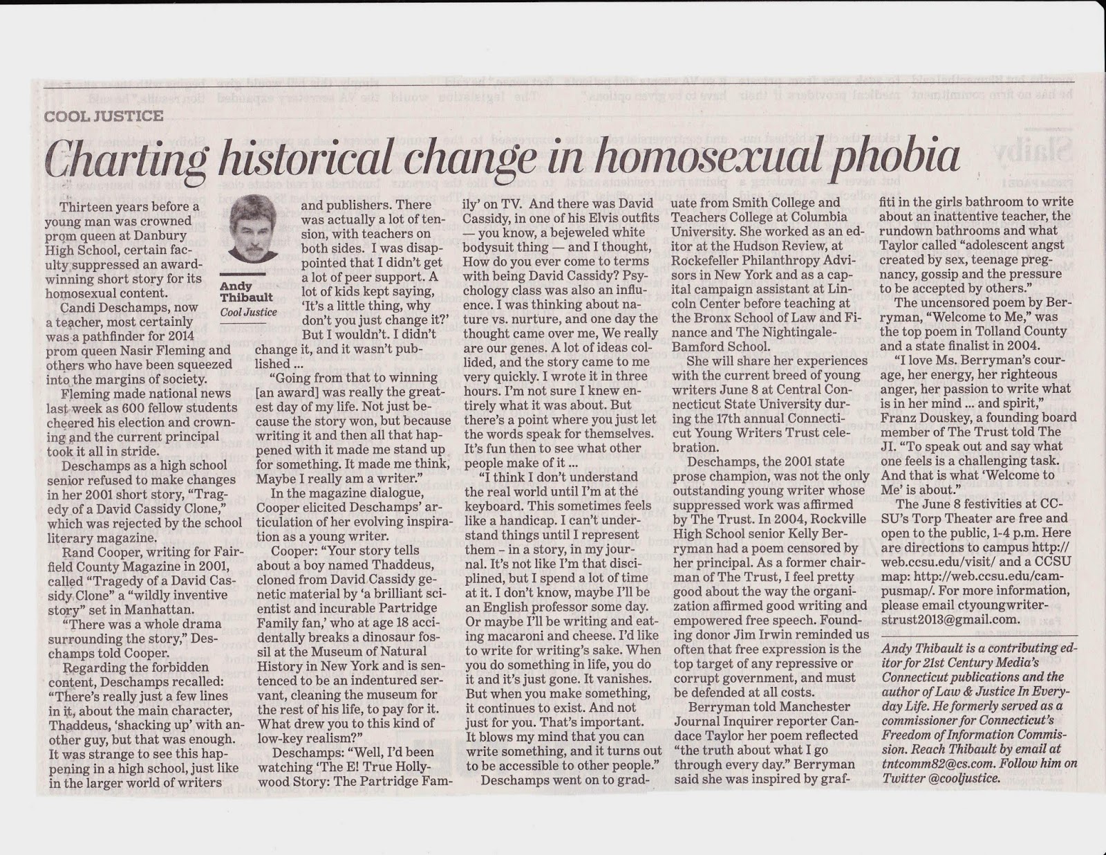Thirteen years before a young man was crowned prom queen at Danbury High School, certain faculty suppressed an award-winning short story for its homosexual content.