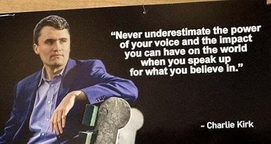 Along with Kirk’s image, the poster included one of his quotes: “Never underestimate the power of your voice and the impact you can have on the world when you speak up for what you believe in.”
