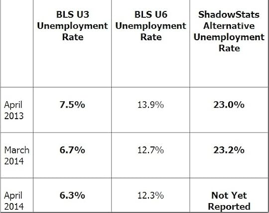 Below is a more complete unemployment table that includes the seasonally adjusted unemployment percentages for U3 unemployment as well as the same for U6 unemployment, followed by the ShadowStats Alternative Unemployment rate, comparing April 2013 for March and April 2014.