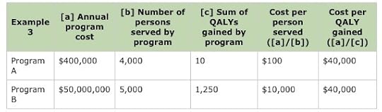 In the following example, the CDC points out that both programs A and B have the same measure of cost-effectiveness in terms of cost per QALY gained. However, Program B is more costly to implement than A. Investment in Program B, the CDC argues, “may nevertheless be justified depending on budgetary constraints and the ability to implement for the program in the population and setting considered.”
