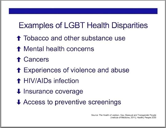 The Institute of Medicine’s 2011 report “Leading Health Indicators for Healthy People 2020,” from which the above graphic was derived, listed on page 53 “disparities” in LGBT health, also described on the HHS “Healthy People 2020” website:
