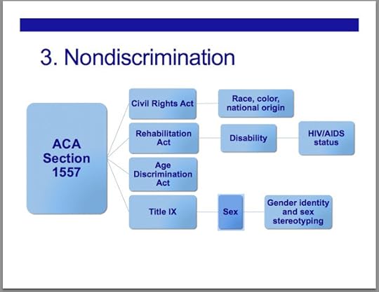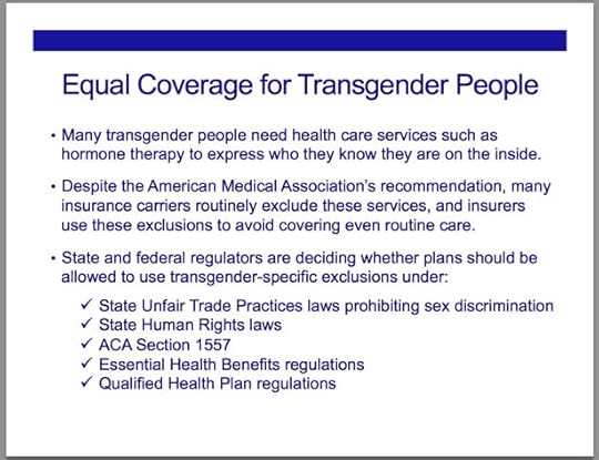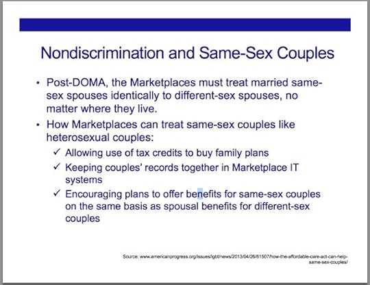 “Now, with the operation of the state-based health insurance marketplaces and the introduction of new provisions for ensuring that insurance plans are comprehensive and of high quality, the Affordable Care Act is providing an unprecedented opportunity to improve the health of many LGBT Americans.”