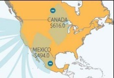 As seen in the North American detail below, trade from Canada extends down into roughly Oklahoma in the United States, and trade from Mexico extends north roughly to Colorado.