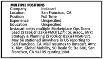Jobs.Now’s reposting exposed the truth: Instacart’s job ads were nowhere to be found on the company’s career page, LinkedIn, or any platform where real applicants look for work. Instead, the posting was buried in a classified newspaper, directing candidates to mail paper resumes to “Global Mobility,” a department that does not hire Americans but oversees visa processing for foreign workers.