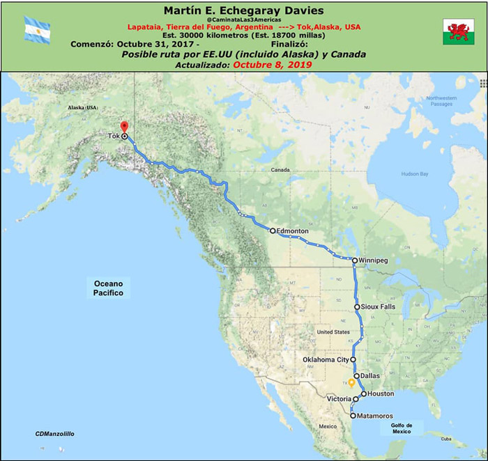 As we celebrate hundred year old Captain, now Colonel, Tom Moore for his walking and charity fund raising efforts – 100 laps of his 82 foot garden, 30 million quid, do let’s, spare a thought for the heroic failure of Martin Echegaray Davies, a man who two years ago set off walking from to Patagonia to Alaska.