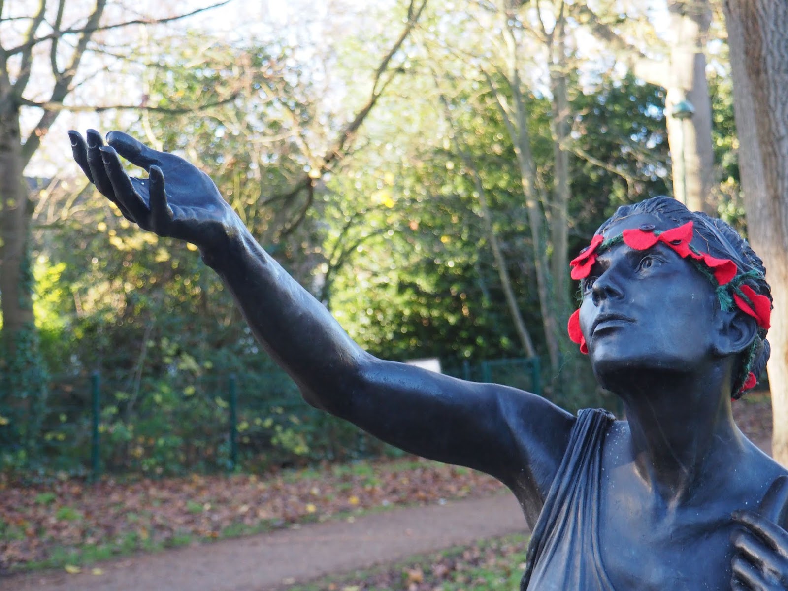 The statue was presented to the city in 1907 and moved around, ending up in 1939 in the Ball Memorial Gardens. But the statue was stolen in 1998, so what’s there now is a replica, and its been moved round the back of the International Gardens Cities Exhibition, away from prying and criminal eyes.